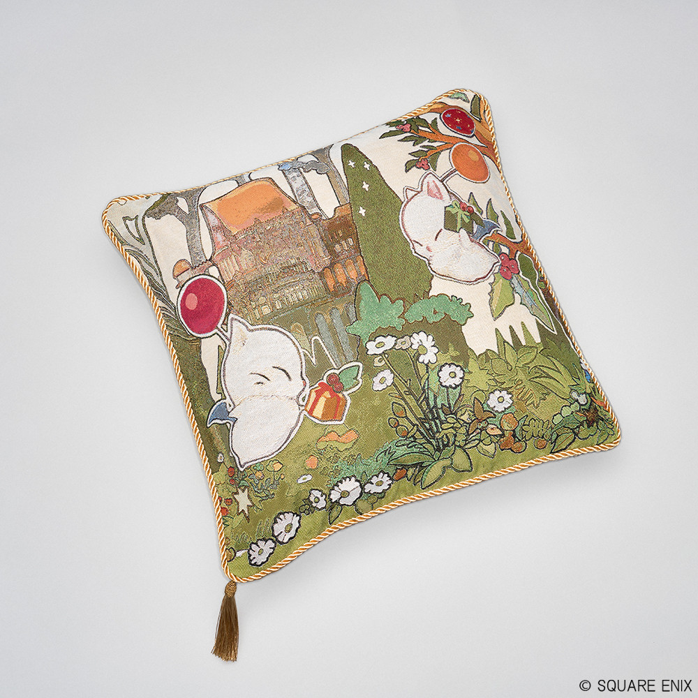 A decorative cushion cover featuring Gridania's tranquil scenery and playful moogles!